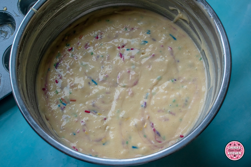 Tip: Use gel-based sprinkles so the colours don’t bleed in the batter.