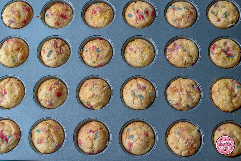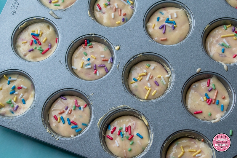 - Using a small cookie scoop, fill each muffin cup then sprinkle a few sprinkles ontop.